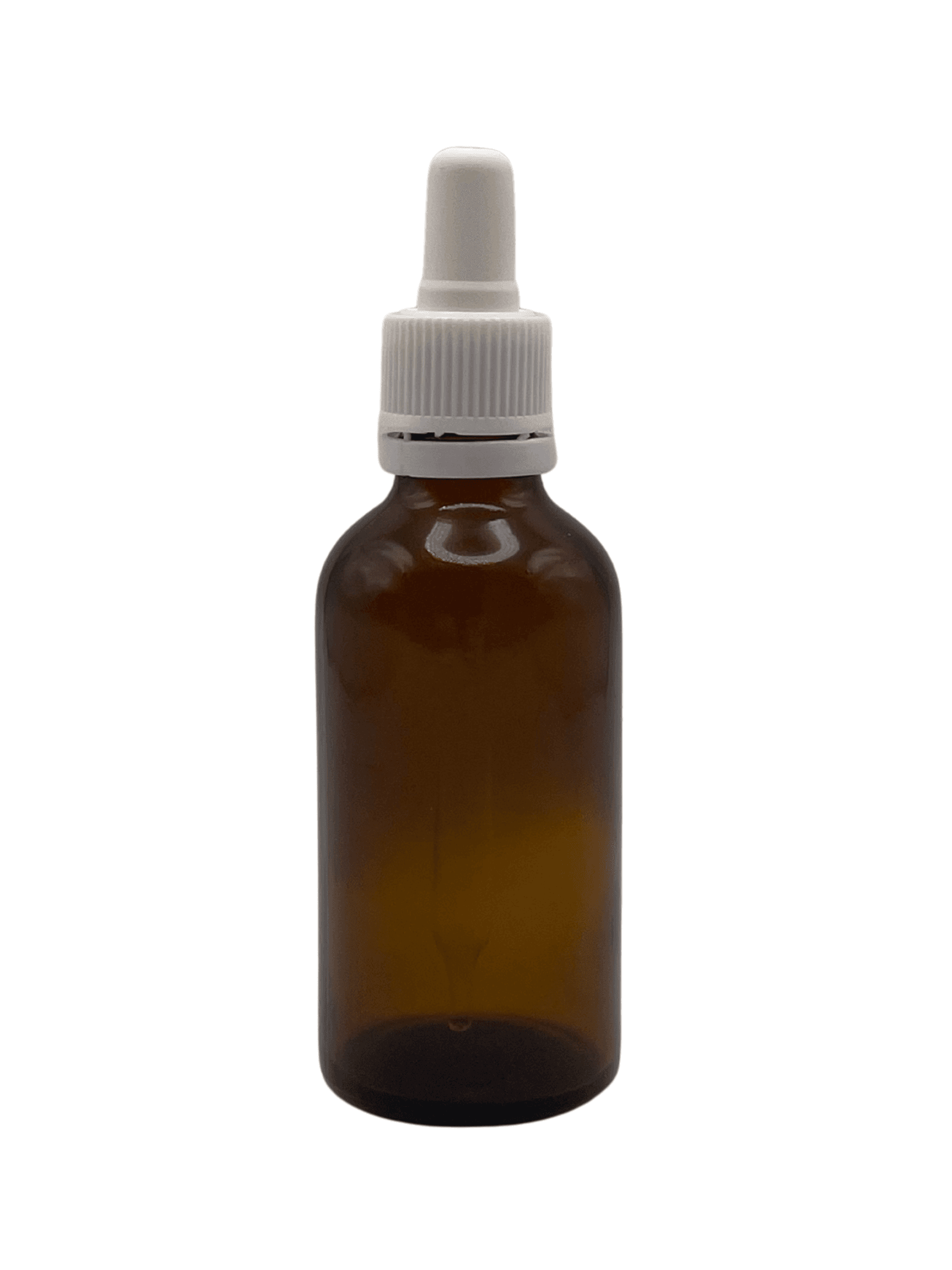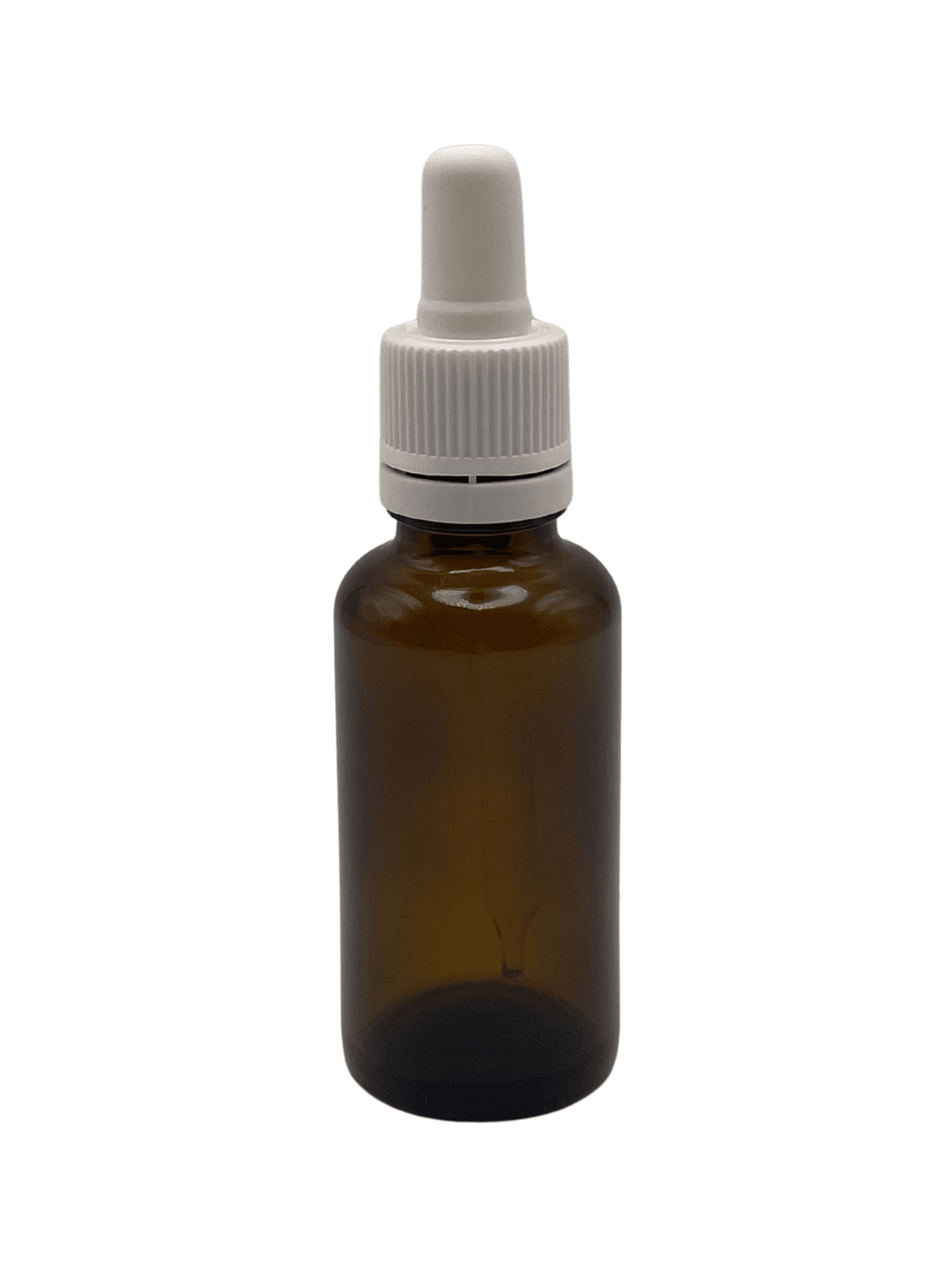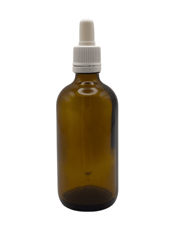 Ce flacon vide en verre ambré, équipé d’une pipette compte-goutte blanche, est conçu pour contenir et appliquer facilement vos préparations liquides.