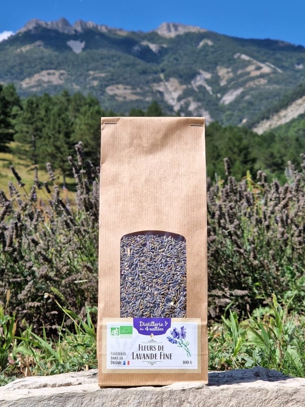 Fleurs de lavande fine Bio tamisées pour la cuisine, cultivées dans la Drôme en Agriculture Biologique (certifiées FR-BIO-10).Nos fleurs de lavande fine sont tamisées et mises en sachet à la maison.Elles peuvent s’utiliser :- pour la cuisine : dans vos plats chauds (en remplacement du thym par exemple), dans vos desserts (crème brûlée, glace, gâteau au chocolat…), dans vos tisanes, thés ou infusions…Mais aussi :- pour votre santé comme exfoliant doux, dans votre bain…- pour parfumer votre maison : dans vos sachets d’armoire, dans vos pots-pourris, dans le sac de votre aspirateur…- en remplacement du riz lors d’un mariage.