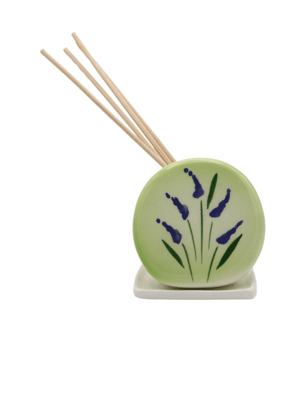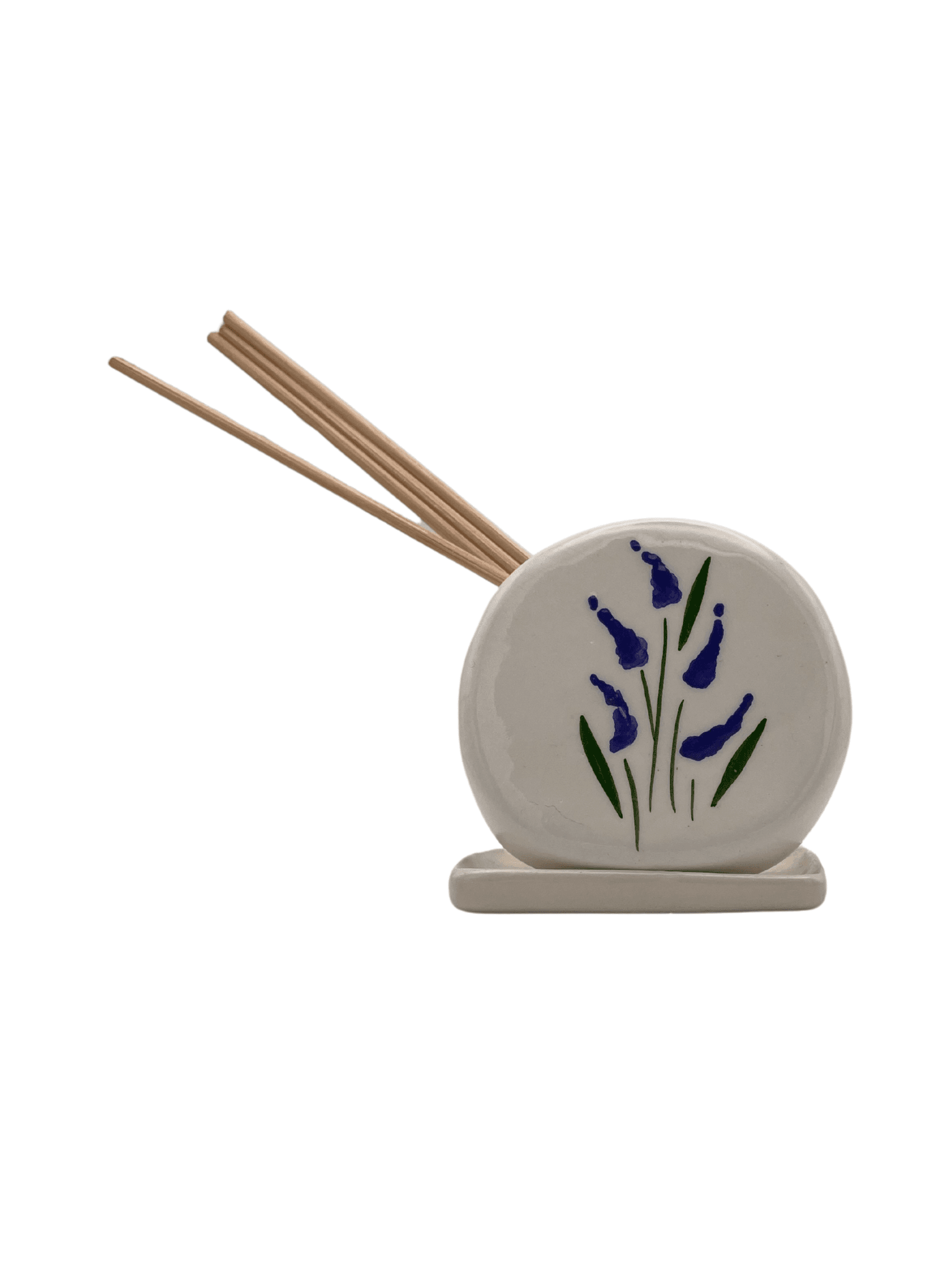 Ce diffuseur à bâtonnets en céramique est décoré d’un motif de fleurs de lavande peint à la main.