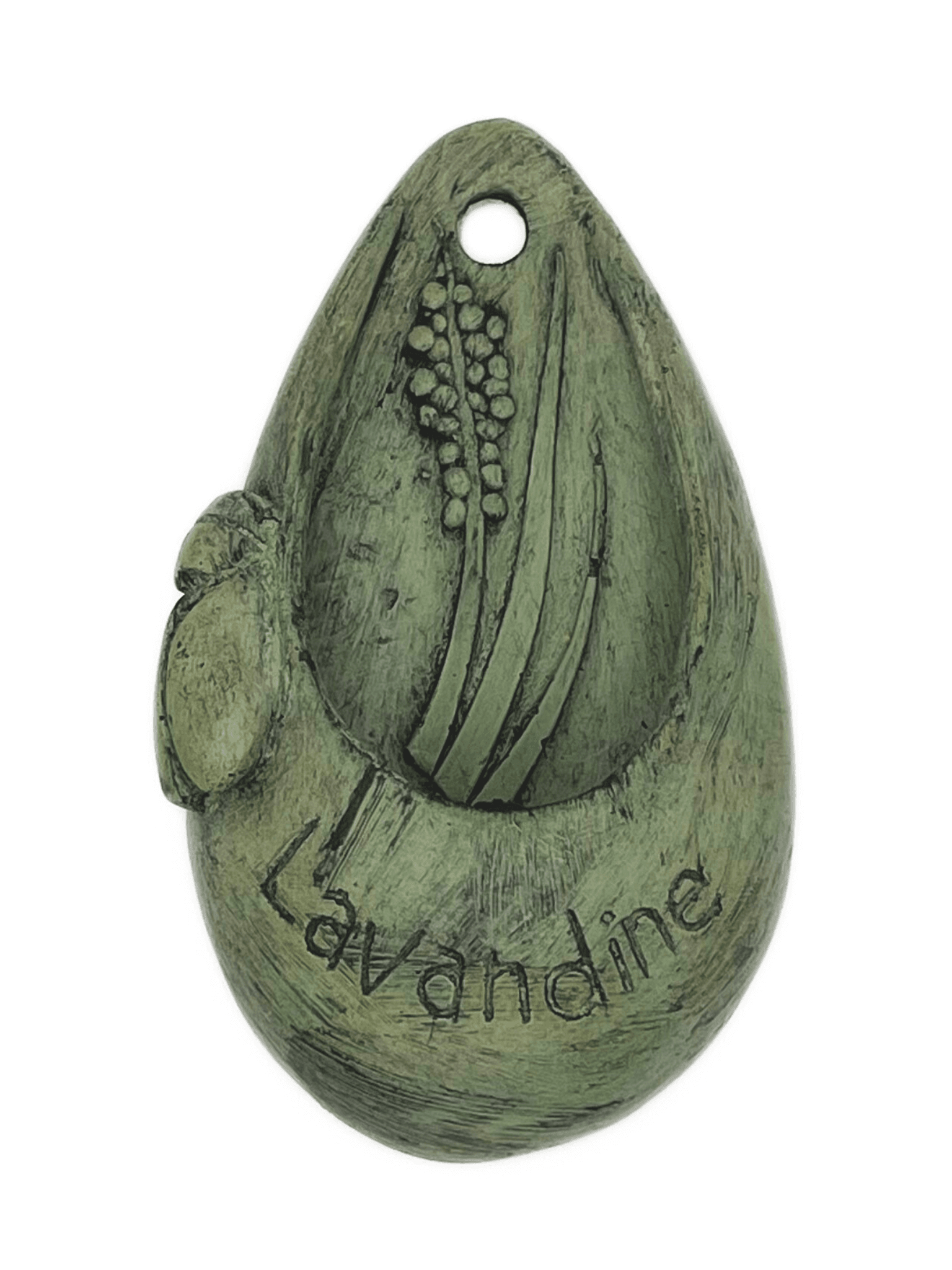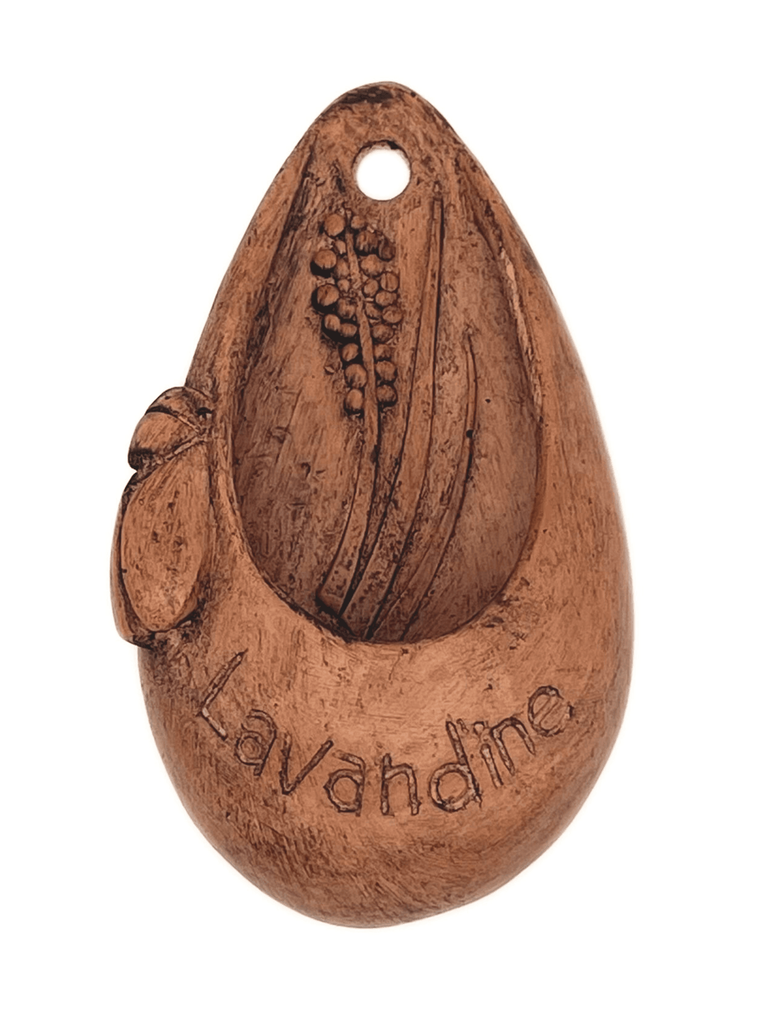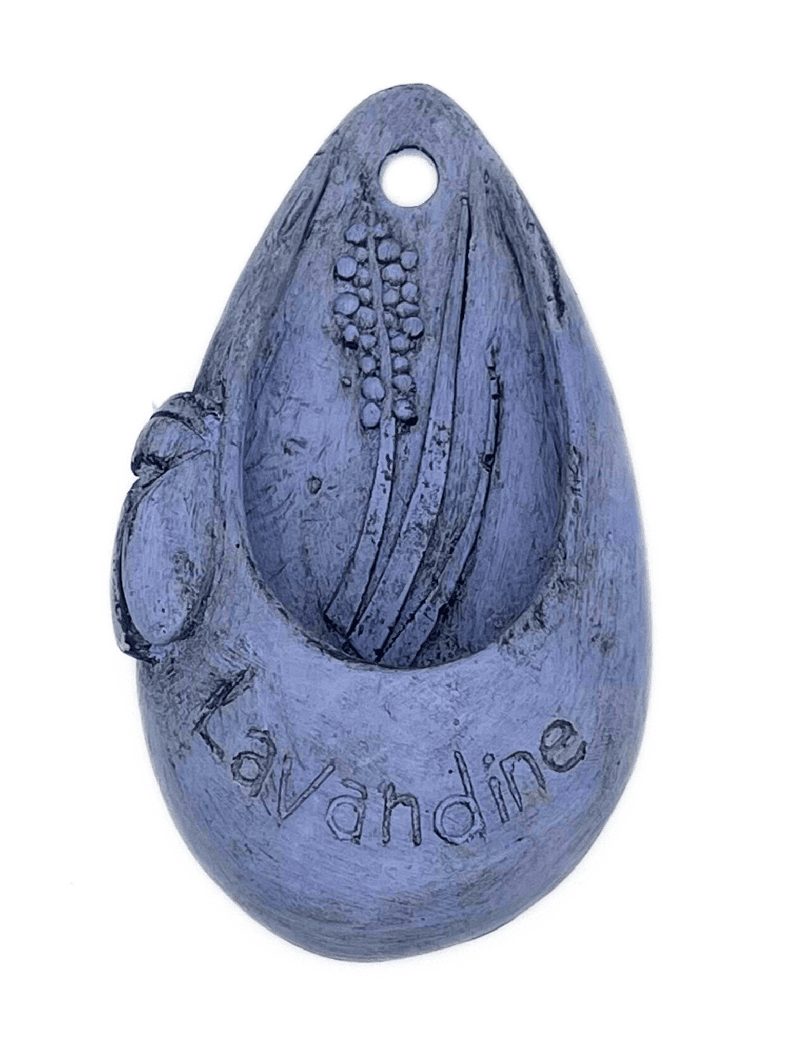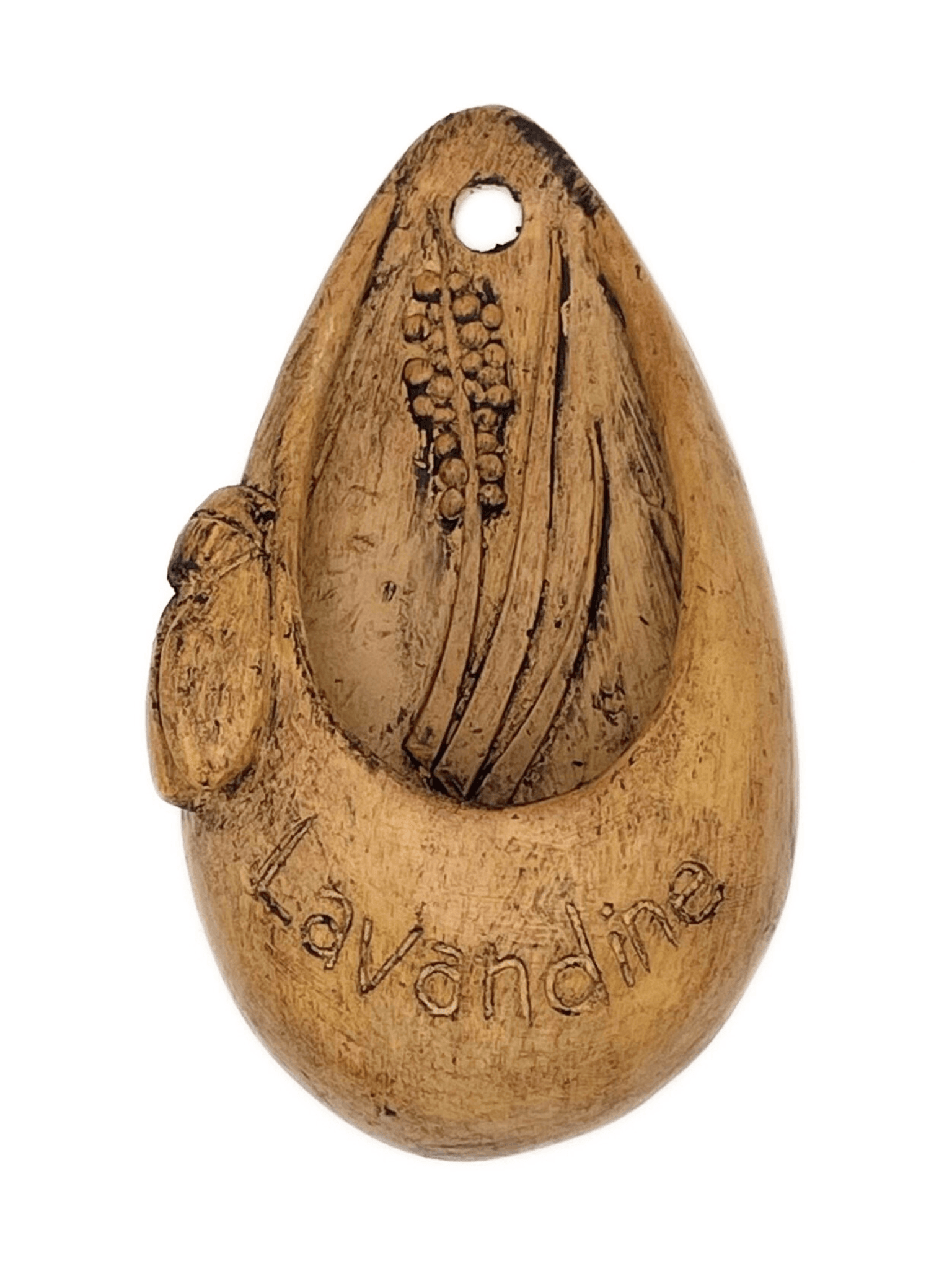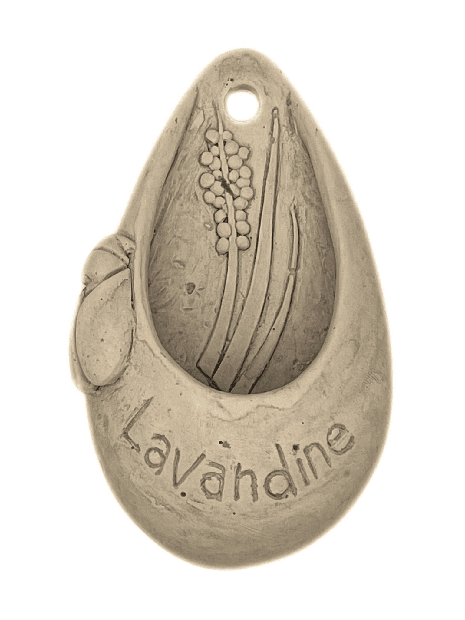 Le décor en relief représente un brin végétal stylisé. En dessous, l’inscription “Lavandine” est gravée directement dans la matière. L’ensemble rappelle les paysages et traditions de la Provence.