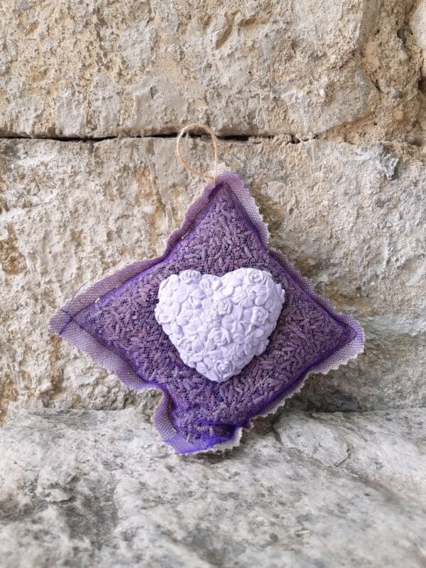 Créé par un couple d’artisans passionnés, Joëlle et Bernard Lizé, ce sachet est fait de deux tissus, lin à l’arrière et tulle violet à l’avant. Il est décoré d’un gros cœur en plâtre de couleur blanche ou lavande, au choix, où vous pourrez déposer quelques gouttes d’huile essentielle.
