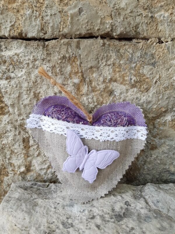 Composition : Fleurs de lavandin séchées, sachet en lin et tulle violet, ruban de dentelle, papillon en plâtre, ficelle en lin