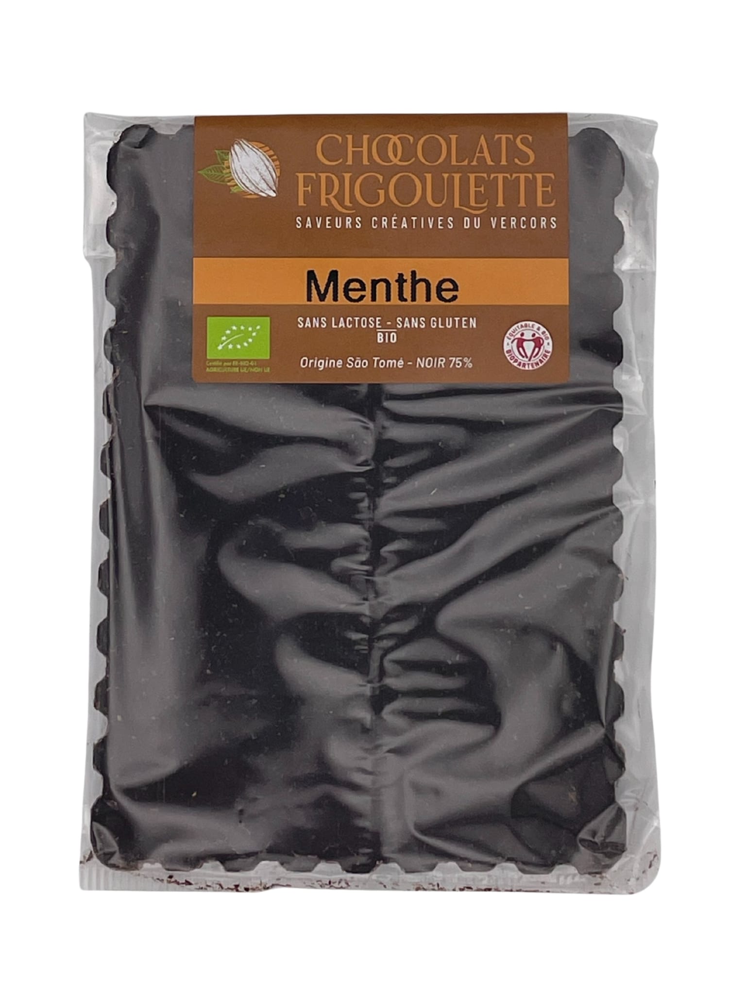 Chocolats Frigoulette – Tablette de chocolat noir à la menthe BIO, chocolat noir 75 % minimum.