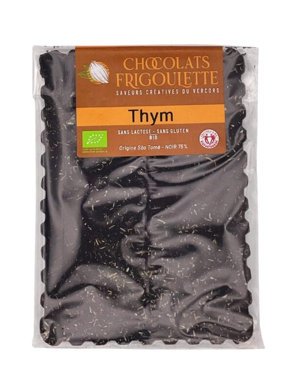 Chocolats Frigoulette – tablette de chocolat noir au thym BIO, chocolat noir 75 % minimum.