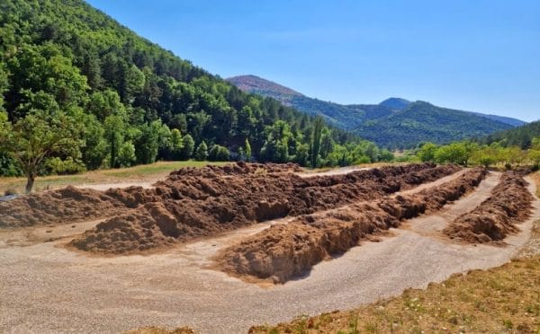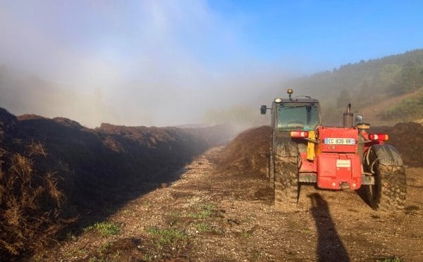 Nous avons mis en place une plateforme de compostage spécialisée. Le processus repose sur un tournage régulier du compost, retourné quatre fois entre septembre et décembre pour garantir une aération optimale et une décomposition homogène, puis sur une phase de maturation prolongée assurant un produit final stable et riche en nutriments.